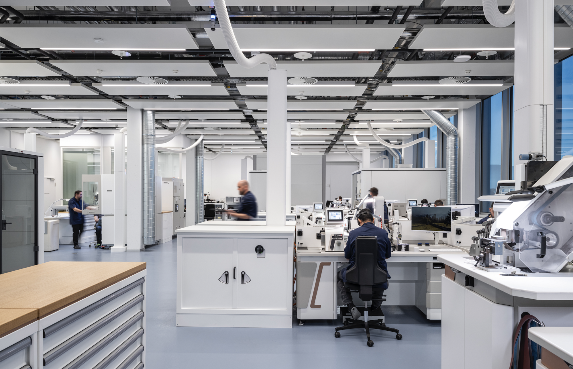 Новый завод продолжает идеи L’Arc: здесь открытые пространства, которые легко менять под новые задачи и рост компании. Всё сделано для того, чтобы вместе работать над созданием сложных и престижных часов.