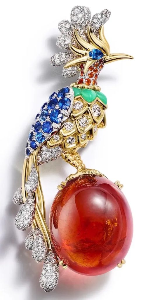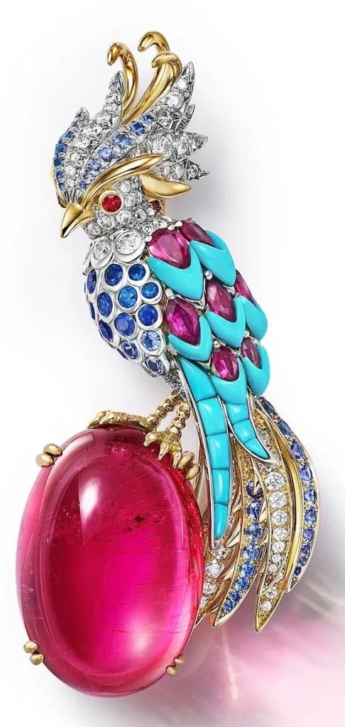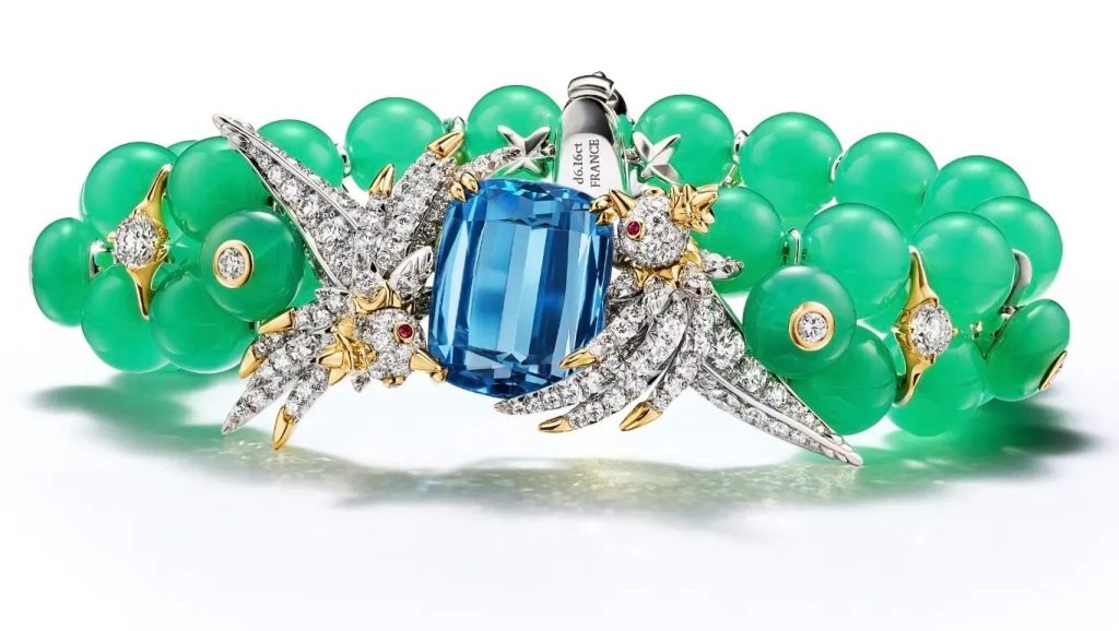 Знаковая «Птица на скале» предстаёт в новом свете: она словно застыла в полёте над светящимися бразильскими аквамаринами и ярким хризопразом. Этот приём — фиксация мимолётного движения — становится лейтмотивом всей коллекции.