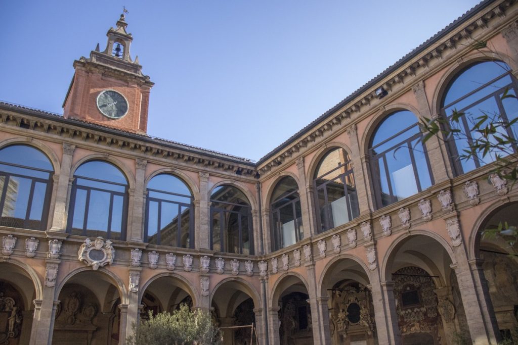 Архимастичный комплекс Архигимназии, связанный с историей Болонского университета, возник в XVI веке по инициативе Папы Пия IV. Изначально это было учебное заведение, работающее до начала XIX века. Теперь здание превращено в обширную библиотеку, включающую коллекцию редких манускриптов и антикварных изданий общим числом более 600 тысяч единиц.
