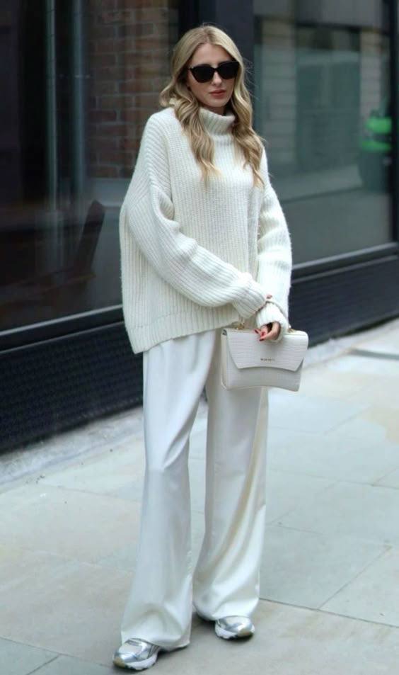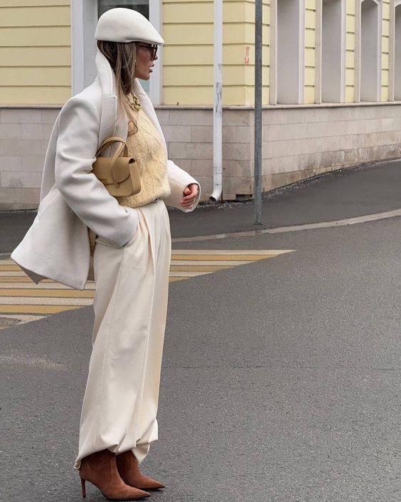 Одно из ключевых направлений сочетаний — монохромные светлые образы. Гармония Cloud Dancer с молочным, кремовым, мягким серым и нюдовыми оттенками создаёт эффект спокойного, воздушного минимализма. Это идеальный выбор для тех, кто любит эстетику «тихой роскоши» без демонстративности и громких модных заявлений. Такие образы визуально вытягивают силуэт, освежают лицо и позволяют играть с фактурами — например, сочетать шелковую блузу, шерстяной жилет и кожаную сумку в одном светлом монохроме.
