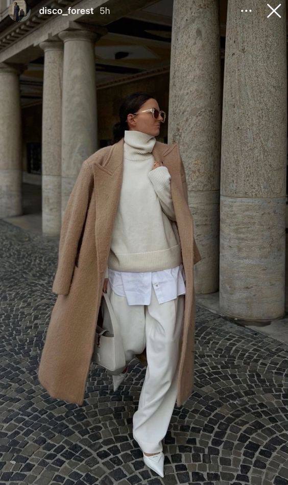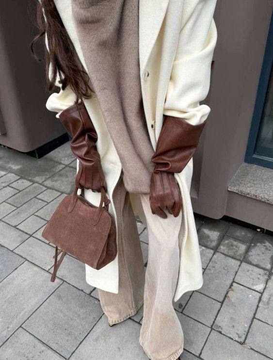 Вторая сильная группа сочетаний — природные, тёплые, землистые оттенки. Беж, песочный, серо-коричневый, цвет натурального дерева и сухой травы создают органичную, естественную палитру. Это отличное решение для повседневного стиля или капсул, где важна универсальность. Образ в Cloud Dancer + тёплый беж смотрится мягко и гармонично, а в сочетании с натуральными тканями (лён, хлопок, шерсть) получается особенно естественным.