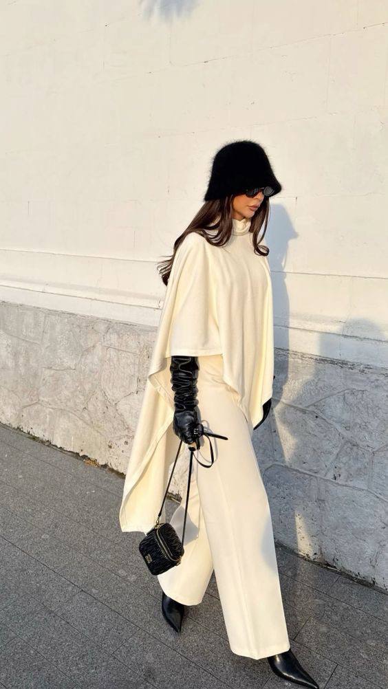 Для более смелых образов подойдутконтрастные тёмные акценты — графит, глубокий синий, насыщенный шоколад, оливковый или хаки. В таких соединениях Cloud Dancer становится идеальным «фоном», а тёмный цвет — выразительным центром. Белый верх + тёмные структурированные брюки, или пальто в оттенке Cloud Dancer + тёмная водолазка — это про современную, архитектурную эстетику.