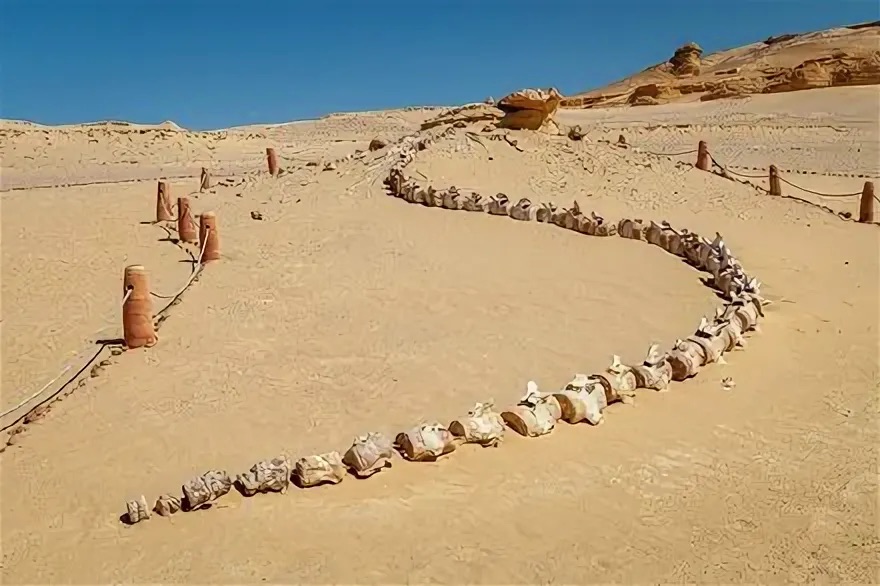 Однажды бывшая океанским дном древнего океана Тетис, сегодняшняя пустыня Вади аль-Хитан, или «долина китов», стала свидетелем эволюции огромных морских животных. Ученые нашли здесь кости китообразных, включая внушительных размеров базилозавра, чьи размеры достигали десяти метров в длину. Наряду с ними обнаружены остатки других древних морских существ, таких как акулы и черепахи.