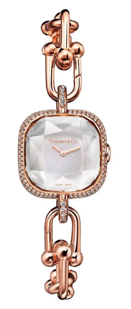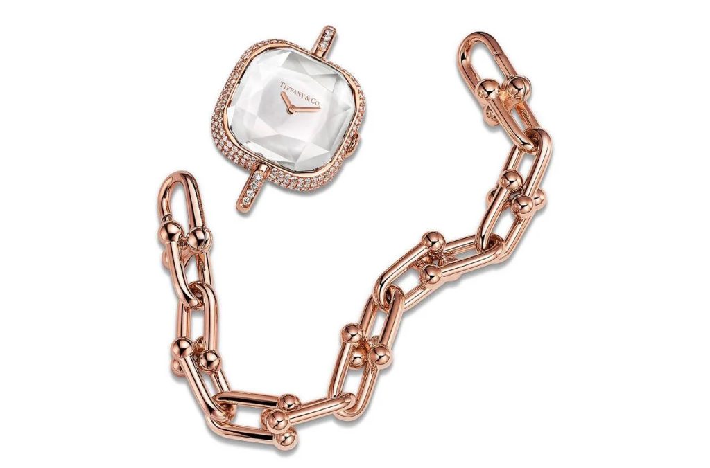 Часы Tiffany HardWear из розового золота с бриллиантами и перламутровым циферблатом.