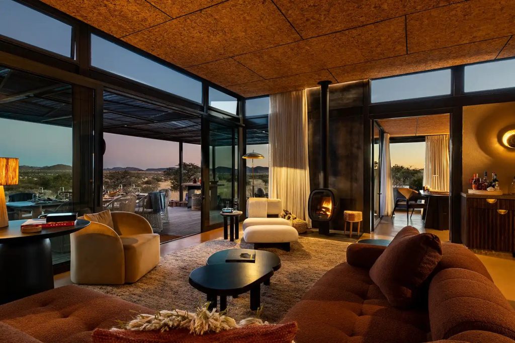 Интерьеры дома созданы студией Gregory Mellor Design. Вдохновляясь природой Калахари, дизайнеры использовали крупные органические формы, натуральные материалы и сдержанную палитру оттенков песка и трав. Особое внимание уделено долговечности и экологичности: плотный лён, плетёный мохер, латунь, камень и дерево. «Мы вдохновлялись формами природы, а не копировали их», — отмечает Грег Меллор. «Важно было создать ощущение прохлады в жару и тепла в холод, подчеркнуть масштаб ландшафта и влияние времени на природные элементы».
