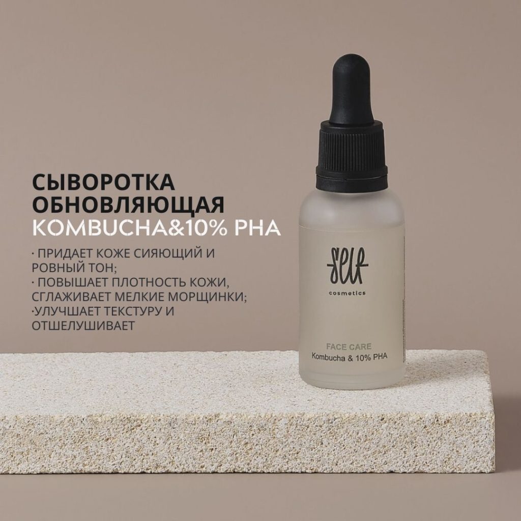Один из новых ингредиентов на рынке – камбучка. Сыворотки с ней делаю кожу более плотной и упругой, уменьшают заломы на лице. Хороший вариант рабочей дозировки ввода камбучки можно увидеть в сыворотке — Self cosmetics сыворотка обновляющая KOMBUCHA & 10% PHA