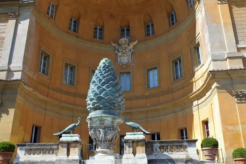Именно отсюда начинаются прогулки по музеям Ватикана. Название двора объясняется наличием гигантской бронзовой скульптуры, изображающей сосновую шишку, датируемую I веком до нашей эры. Изначально шишка использовалась как элемент фонтана, располагавшегося вблизи Пантеона. Рядом размещена современная работа «Сфера внутри сферы», выполненная в 1990 году итальянским художником Арнальдо Помодоро. Внутренняя сфера олицетворяет Землю, наружная — вселенную, а трещины символизируют ущерб, наносимый человечеством природе.
