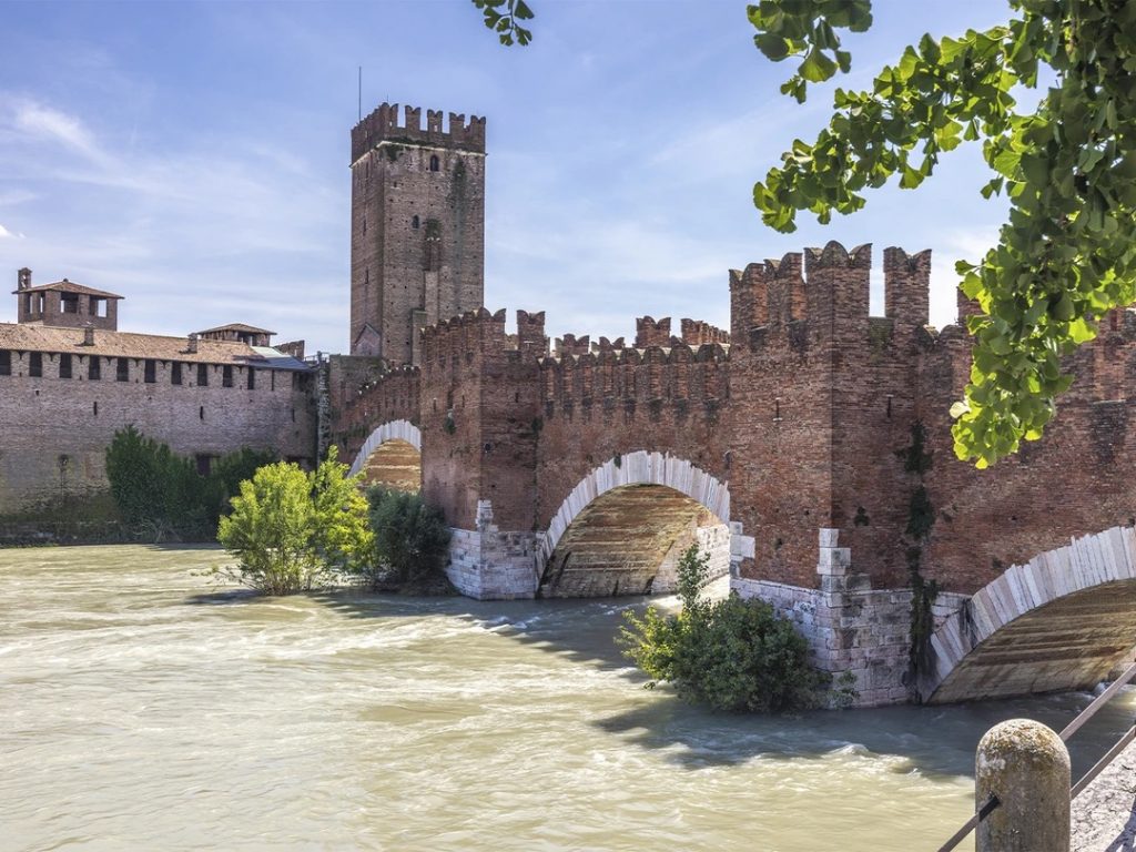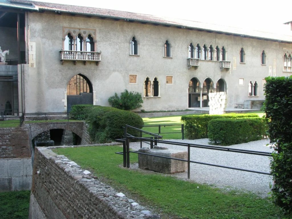 Огромный кирпично-красный замок Кастельвеккьо, возведённый в конце XIV века, являлся резиденцией властителя Вероны — Кангранде II делла Скала. Крепость выделяется своим мощным внешним видом, напоминающим оборонительные укрепления, включая глубокие рвы, башни с характерными треугольными зубцами («ласточкин хвост»), подобными московскому Кремлю, и мощную башню-донжон.