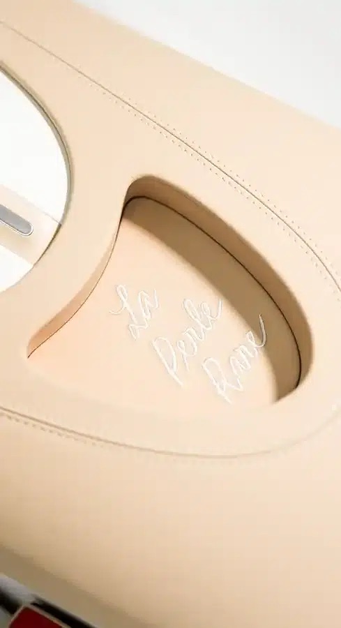 Название «La Perle Rare», написанное рукой Штрауба, встречается в разных местах автомобиля. Это не просто логотип, а аккуратная подпись — она вышита, выгравирована или нарисована прямо на деталях.