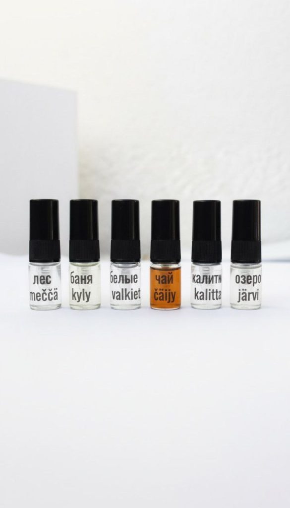 Внутри вы найдете буклет с описанием ароматов, где вы сможете узнать больше о каждом из них; шесть мини-флаконов, название аромата указано на карельском и русском языках и блоттеры для нанесения. Для всех, кто хочет увезти частичку Карелии с собой.