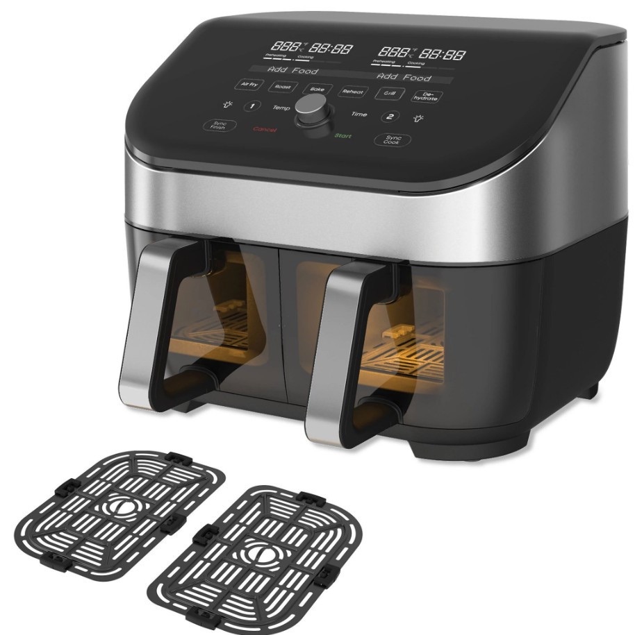 Главное преимущество этой модели — наличие двух отдельных отсеков (корзин) объемом до 4,75 литра каждый (общий объем около 9,5 литра). Это позволяет готовить в двух корзинах одновременно, используя разные настройки температуры и времени для каждого блюда. Позволяет завершить приготовление блюд в обеих корзинах одновременно, даже если они требуют разного времени или температуры.