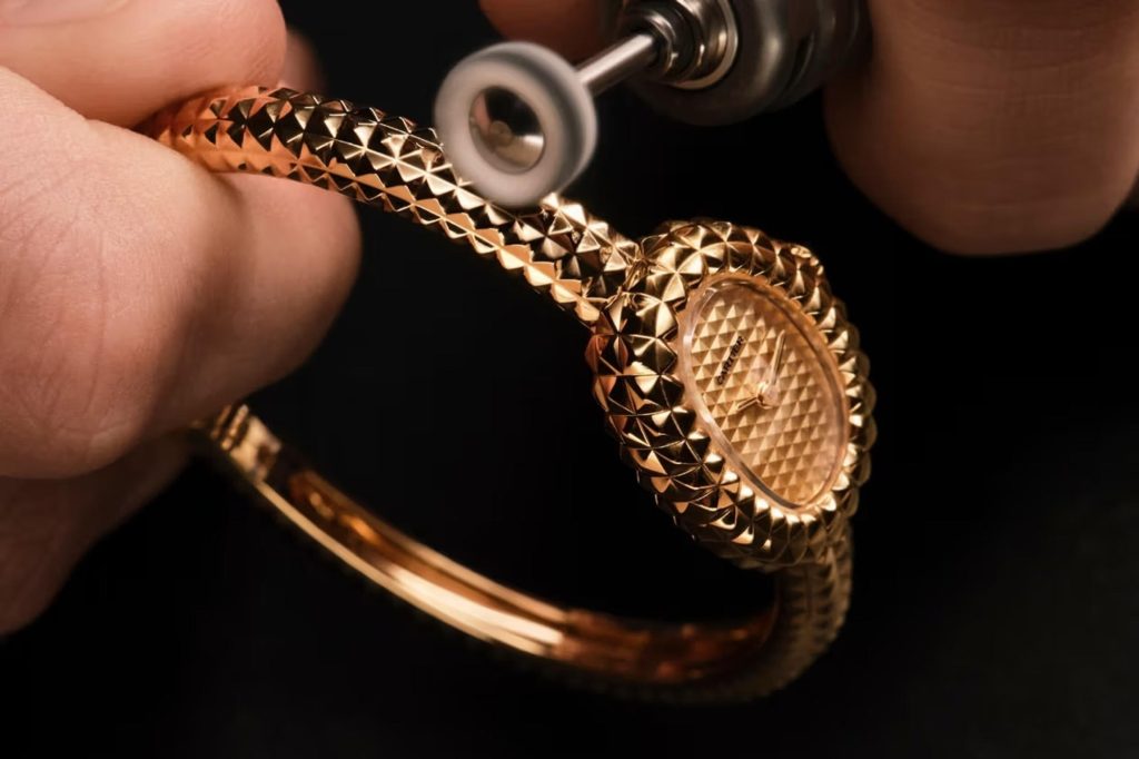 Cartier предлагает свежую трактовку своей знаковой модели Baignoire, переосмыслив её через призму знаменитого узора Clou. Этот характерный декор, выполненный в единой стилистике, органично объединяет корпус, циферблат и браслет, формируя целостный и запоминающийся образ. Благодаря виртуозной работе с фактурой часы выходят за рамки простого аксессуара, становясь настоящим произведением ювелирного искусства.